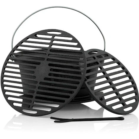 Con la pentola per barbecue, siete perfettamente attrezzati per una grigliata. La griglia, realizzata in ghisa, è già bruciata e può essere utilizzata direttamente. La griglia è dotata di tre piedini che la rendono ideale per stare in piedi sulla pentola da barbecue. È anche possibile girare la griglia. In questo modo è più vicina alla carbonella.