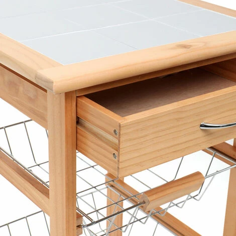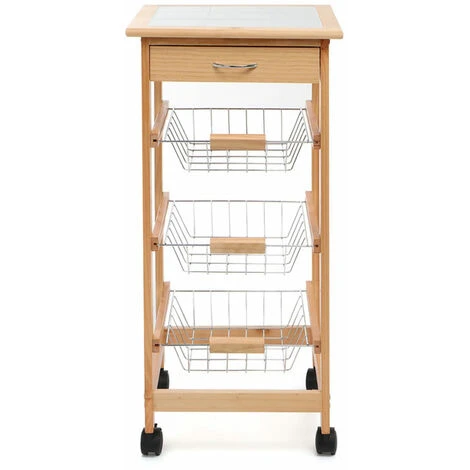 1 x Carrello Cucina in legno 3 Cestelli Acciaio Ripiano 9 Mattonelle Ceramica Beige