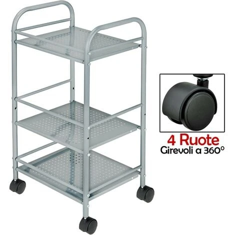 Il carrello è dotato di 3 Ripiani d’appoggio, removibili per funzione vassoio con paratie, oltre a 4 Ruote pivotanti.