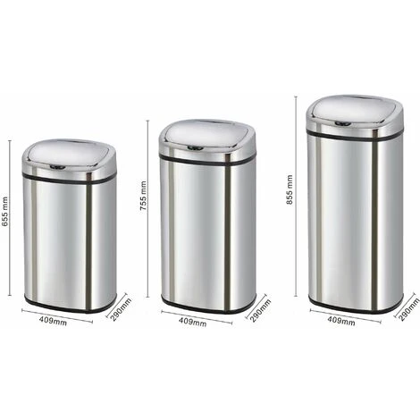 Portarifiuti da cucina automatico rettangolare con reggetta Capacità 80L modello MAJESTIC in acciaio inox Finitura lucida a specchio Dimensioni: 41x29xH86cm Peso: 5kg. Grande capacità Corpo in acciaio inossidabile (0,4 mm) e coperchio in ABS. Funziona con 4 batterie LR20 (non incluse). Pulsante ON/OFF (per mantenere il coperchio aperto). Include: un anello di plastica per tenere il tuo cestino e un anello per il pavimento per proteggere i pavimenti fragili. Cestino intelligente che funziona con un sistema a infrarossi e impedisce di toccare il coperchio del cestino. Pratico e igienico, il coperchio si apre e si chiude automaticamente quando si passa la mano o un oggetto 15 cm sopra la fotocellula. Possibilità di tenere il coperchio aperto grazie ai pulsanti OPEN / CLOSE (per un’apertura prolungata). I suoi materiali lisci (acciaio inossidabile e ABS) lo rendono facile da pulire. Nessun montaggio richiesto. Più che un cestino, un pezzo di arredamento di design. Non c’è bisogno di chinarsi per buttare via i rifiuti. Cestino stabile. Base antiscivolo. Chiusura silenziosa e anti-impronta.