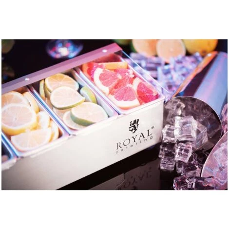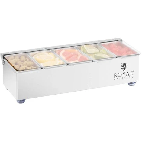 Con il contenitore portacondimenti in acciaio inox ottieni 5 contenitori rimovibili in acciaio inox. Ogni inserto può contenere fino a 0,4 litri e lo scaffale più alto offre un volume totale di 2 litri. Il coperchio trasparente in plastica (PP), grazie alla sua forma, consente di chiudere con sicurezza tutti gli ingredienti, i quali rimangano freschi e gustosi a lungo. Nelle calde giornate estive, il coperchio funge anche da pratica barriera contro gli insetti. Anche la pulizia del contenitore in acciaio inox risulta particolarmente facile, dal momento che tutti i componenti possono essere comodamente lavati in lavastoviglie. Lasciati convincere dall’elevata qualità dei nostri prodotti e dal nostro servizio clienti e compra ancora oggi un contenitore portacondimenti di Royal Catering!