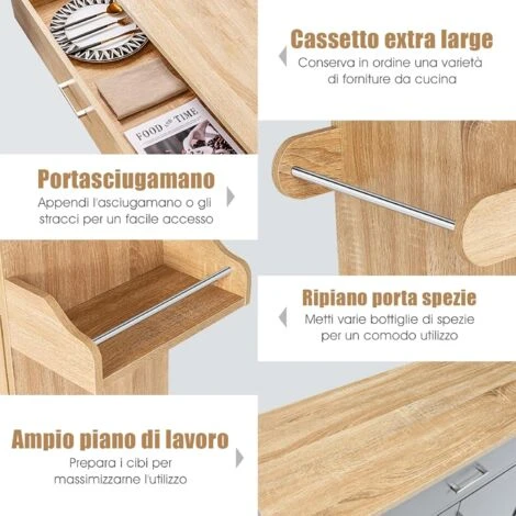 Ti dà fastidio il disordine in cucina? Allora il nostro carrello da cucina è perfetto per te. Con la superficie spaziosa, un cassetto grande e un armadietto, c’è tanto spazio per riporre stoviglie, bicchieri, cibo, ecc. La mensola all’interno dell’armadietto si può regolare in 3 posizioni a seconda delle dimensioni degli oggetti. Inoltre, il ripiano delle spezie e il portasciugamani sono comodi per prendere lo strofinaccio e i barattoli delle spezie. Con 4 ruote universali (2 con freno), è facile da spostare e molto sicuro da usare. Quando hai bisogno di una superficie extra o di conservare gli utensili da cucina, il nostro carrello è la scelta perfetta!
