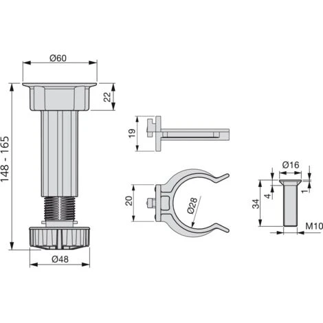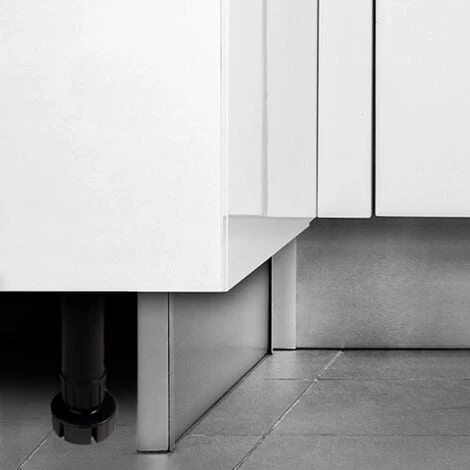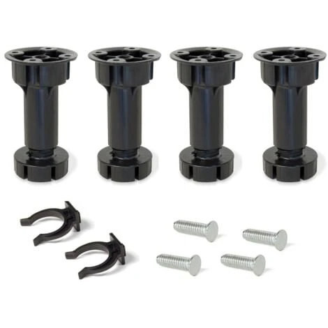 Set di 4 piedini regolabili per moduli inferiori di cucina o bagno con i loro accessori di montaggio. Ogni set viene imbalato separatamente e comprende 4 piedi regolabili con base di fissaggio integrata, 4 viti di montaggio al mobile e 2 ganci per zoccolo. Hanno regolazione in altezza di 148 mm a 165 mm e sono ideali per installarli con zoccoli di altezza 150 mm. Fabbricati in plastica di colore nero, ogni piedino supporta un peso de 40 kg di carico a compressione.