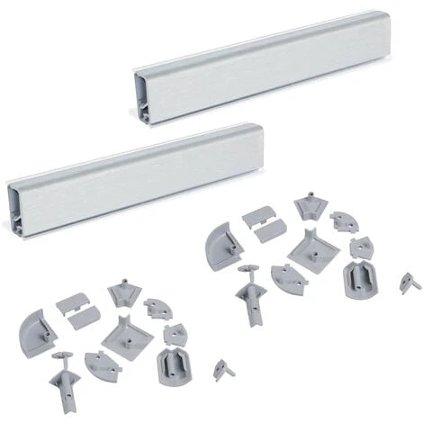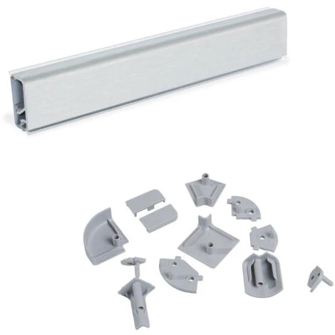Le barre di alzatine sono fornite di lunghezza 2,35 metri con giunti flessibili integrati e hanno una finitura anodizzata satinata. L’alzatina è realizzata in pvc resistente all’umidità e agli agenti chimici ed è protetta con film plastico. Gli accessori di installazione sono costituiti da 2 set di connettori, angolari e tappi terminali e sono realizzati in plastica grigia.