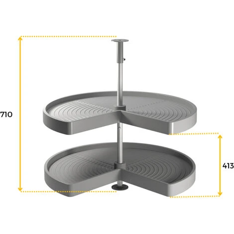 Cestelli girevoli tre quarti progettati per ottimizzare lo spazio in moduli ad angolo di cucina a forma di L. Sono facili da installare e adattabili a diverse altezze dei moduli. Sono disponibili per misure di moduli da 800 mm e 900 mm e finiture bianche e grigie . Il sistema è composto da 2 vassoi e accessori di montaggio in plastica riciclabile, antistatico, ad alta resistenza agli urti e ai raggi ultravioletti e una barra centrale in alluminio anodizzato opaco. Hanno una capacità di carico di 20 kg per vassoio .