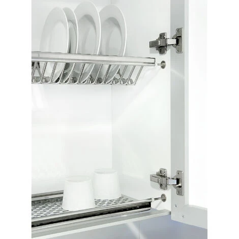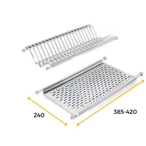 Scolapiatti per stoviglie con due piani e vassoio raccogligocce, prodotto completamente in acciaio inossidabile (le griglie per i piatti e i bicchieri in acciaio inossidabile AISI 430 e il vassoio raccogligocce in acciaio inossidabile AISI 304). Migliora ed ottimizza l’ordine dei piatti e dei bicchieri nei mobili della cucina. L’istallazione è molto semplice e il fissaggio al mobile molto resistente: montaggio mediante 8 perni laterali che regolano il vassoio al mobile.