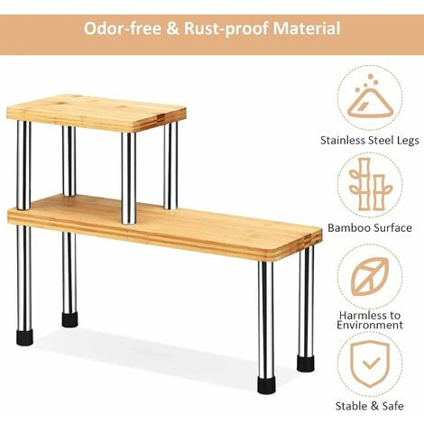 La combinazione di bambù e acciaio inox rende lo scaffale universale forte e durevole. Due metodi di montaggio possono soddisfare le vostre diverse esigenze. Inoltre, la mensola angolare dispone di piedini antiscivolo per garantire stabilità ed evitare graffi. Grazie alle sue dimensioni compatte, il ripiano da cucina occupa pochissimo spazio ed è adatto per conservare spezie in cucina o articoli da toeletta in bagno