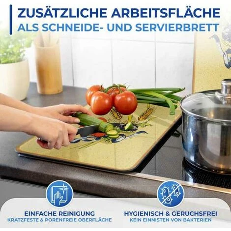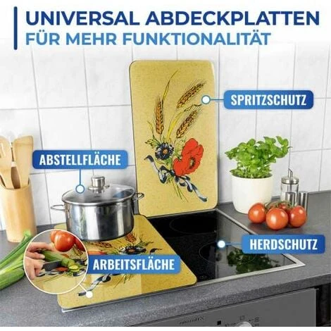 Mit den Abdeckplatten Kornblumen kommt der Sommer in die Küche. Das Glas-Abdeckplatten-2er Set mit dekorativem Fotomotiv gibt dem Herd zusätzliche Funktionalität. Die Platten schützen ihn zuverlässig und ob Glaskeramik-, Elektro- oder Gasherd. Die acht dazugehörigen rutschfesten Spezialfüße gewährleisten stets den nötigen Abstand. Die Herdabdeckplatten eignen sich zum Abstellen von warmen Töpfen und Pfannen. Ebenso können sie als zusätzliche Erweiterung der Arbeitsfläche zur Vorbereitung von Speisen dienen. Ihre kratzfeste, porenfreie Oberfläche wird höchsten hygienischen Ansprüchen gerecht, da sie das Einnisten von Bakterien und Gerüchen verhindert. Die extrem robusten und nahezu unzerbrechlichen (schlagfesten) Platten verfügen über Europäischen Patentschutz.L: 30 cm x A: 1,8-4,5 cm x P: 52 cm, je Platte
