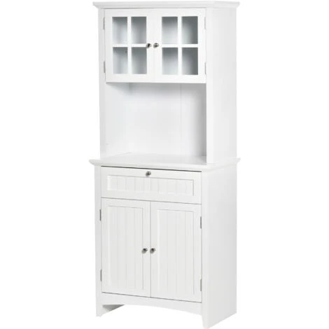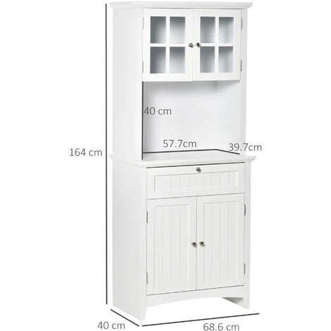 Crea più spazio con questa dispensa da cucina HOMCOM. Il mobile dispensa alto presenta due armadietti separati, un’area centrale aperta e un ampio cassetto per soddisfare ogni tua esigenza di spazio. L’armadietto superiore è dotato di ante in vetro per vedere facilmente l’interno, mentre l’area superiore e inferiore è dotata di ripiani regolabili. La struttura in MDF della credenza moderna è inoltre rifinita con uno strato di vernice liscia per una maggiore protezione.
