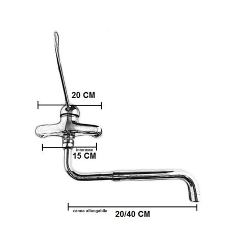 Miscelatore con leva clinica e canna allungabile Comodità, versatilità in cucina! Miscelatorecon leva clinica e canna allungabile a parete da 20 a 40 cm , e girevole. Questo miscelatore è l’ideale per cucine industriali o commerciali ma non solo Interasse standard da cm 15