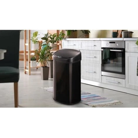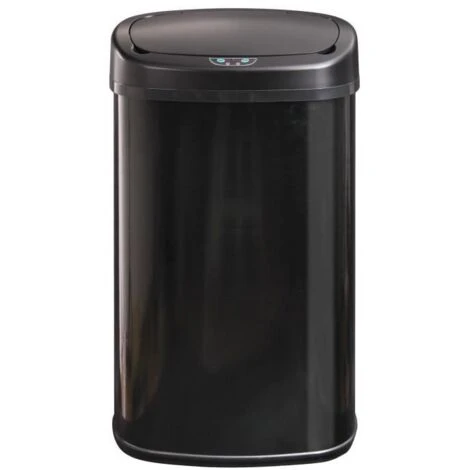 Pattumiera automatica rettangolare da cucina con reggia capacità 68L modello MAJESTIC in acciaio inox – Finitura nera opaca – Dimensioni: 41x29xH76cm – Peso: 4kg – Grande capacità – Corpo in acciaio inox (0,4mm) e coperchio in ABS – Funziona con 4 batterie LR20 (non incluse) ). Pulsante ON / OFF