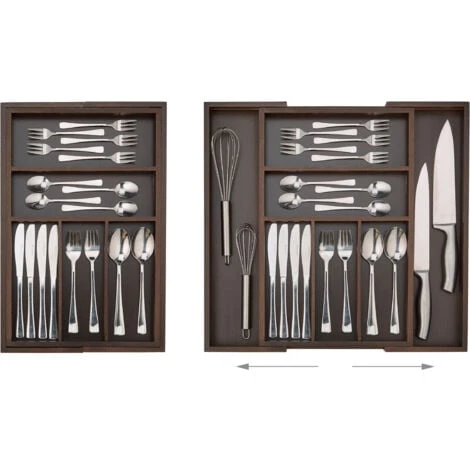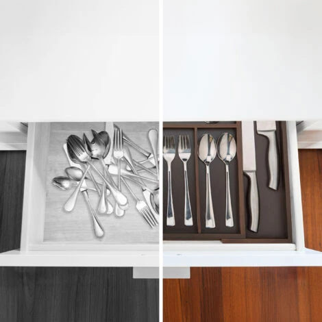 Il portaposate da cassetto in bambù è regolabile in larghezza, grazie ai due scompartimenti esterni estraibili. Per questo si adatta a qualsiasi tipo di cassetto con misure standard. Nella sua larghezza minima, questo contenitore presenta 5 scomparti lunghi e capienti per coltelli, forchette, cucchiai e posate da dolce. Tirando il portaposate dai lati, potrete utilizzare altri 2 scomparti per utensili da cucina come frusta, mestoli e tanto altro. Questo contenitore è lo strumento perfetto per suddividere e fare in ordine nel cassetto della cucina.