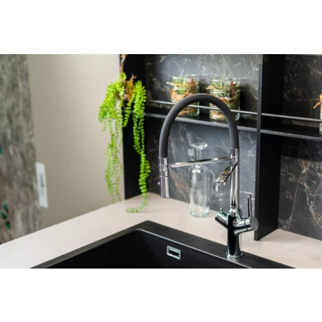 Rubinetto tre vie cucina cromato per utilizzo con filtro depuratore, canna colorata movibile e doccia staccabile 2 getti