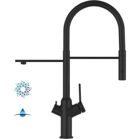 Rubinetto cucina 4 vie per utilizzo con sistemi frigogasatori e filtro acqua depuratore, canna colorata movibile e doccia staccabile 2 getti – Nero Opaco