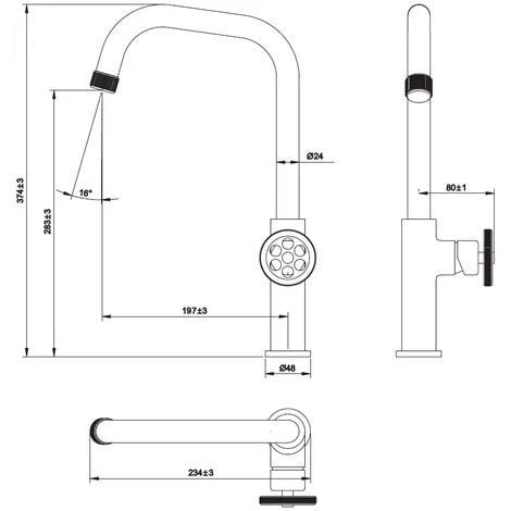 – Larghezza dall’uscita dell’acqua all’asse del corpo del rubinetto: 19,7 cm
