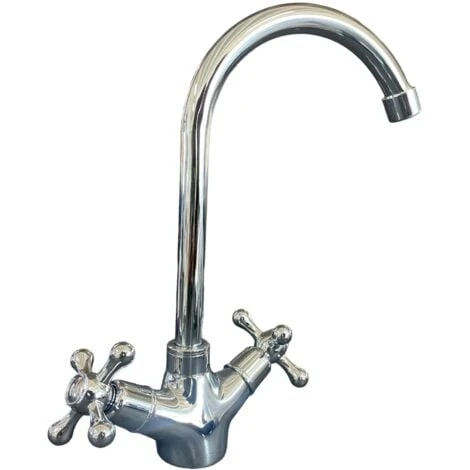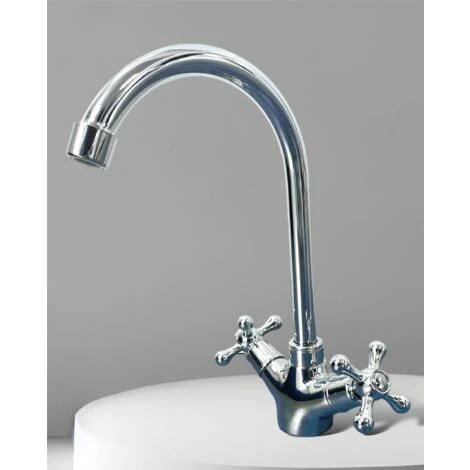 RUBINETTO PER CUCINA LAVELLO CANNA OMBRELLO Rubinetto canna curva maniglie a stella Questo miscelatore per lavello per cucina o lavanderia può essere comunque utilizzato anche in ambienti bagno retrò per dare un tocco di vintage alla tua casa. Ha attacchi standard per essere installato in ogni casa ed è maneggevole e comodo grazia alla sua canna alta e girevole. Il rubinetto è fatto in ottone cromato ed ha maniglie a stella, viene fornito completo di tutto l’occorrente per essere utilizzato: areatore e tubinetti e fissaggi.