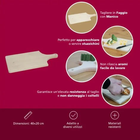 Realizzato in legno di faggio, un materiale naturale resistente, che non richiede particolari cure e soprattutto non rovina le lame dei coltelli.