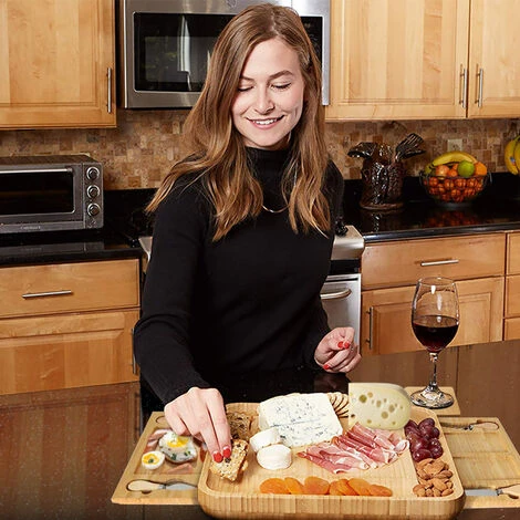 Elegante e sofisticato, il nostro tagliere per formaggi in bambù misura carne, frutta e formaggio con due cassetti nascosti per noci e cracker.