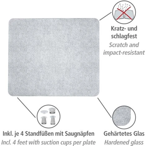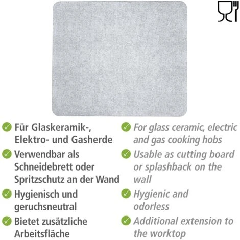 For glass ceramic, electric and gas cooking hobs,Hygienic and neutral in odour,Scratch and impact-resistant, heat-resistant up to 200°C,Crystal glass with 4 anti-slip feet,Dimensions (W x H x L): 50 x 4.5 x 56 cm